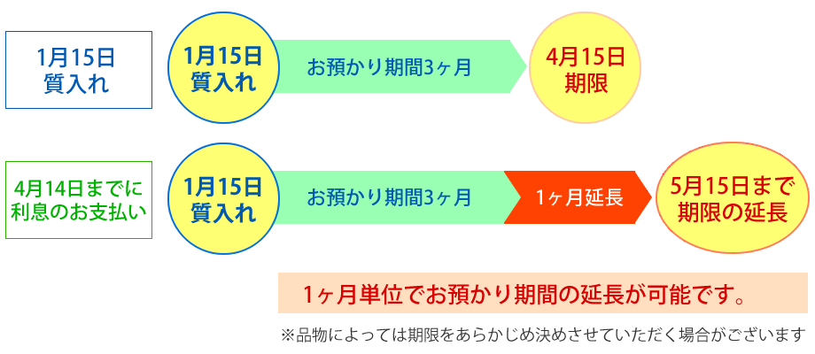 質屋の利息は、質屋に品物を預けた日より起算して、満3か月です。期限まではいつでも利息と借入金をお支払いいただくことで、引き出しが可能です。
